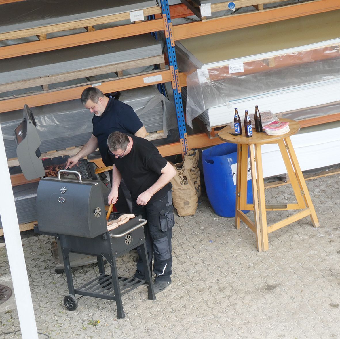 Ende April 2022 lud Chef Richard Niegelhell alle Mitarbeiter zum Grillen ein. Bei dieser Gelegenheit wurden auch verdiente Mitarbeiter geehrt: Marc Schreiner hat seine Lehre als Druckvorstufentechniker mit ausgezeichnetem Erfolg abgeschlossen und Offset-Drucker Bernd Färber feiert heuer sein 10-jähriges Dienstjubiläum.